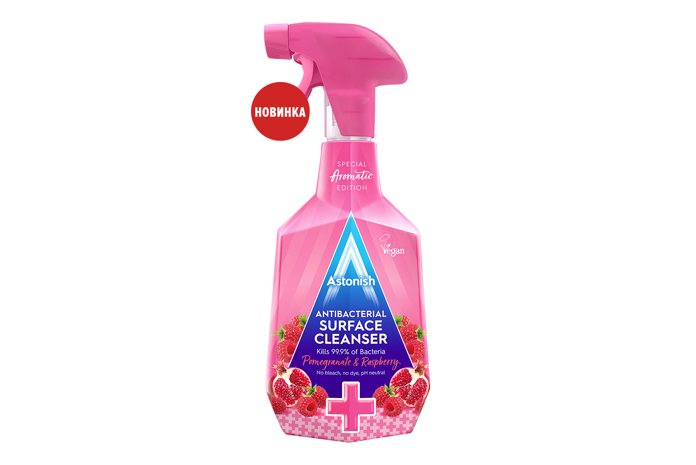 Antibakterial ta’sirga ega sirt tozalagich, anor va malina hidi bilan (ASTONISH Antibacterial Cleanser Pomegranate & Raspberry). U ajoyib tozalash xususiyatlariga ega bo‘lib, antibakterial komponentlar maishiy sirtlardagi bakteriyalarga samarali qarshi kurashadi.
